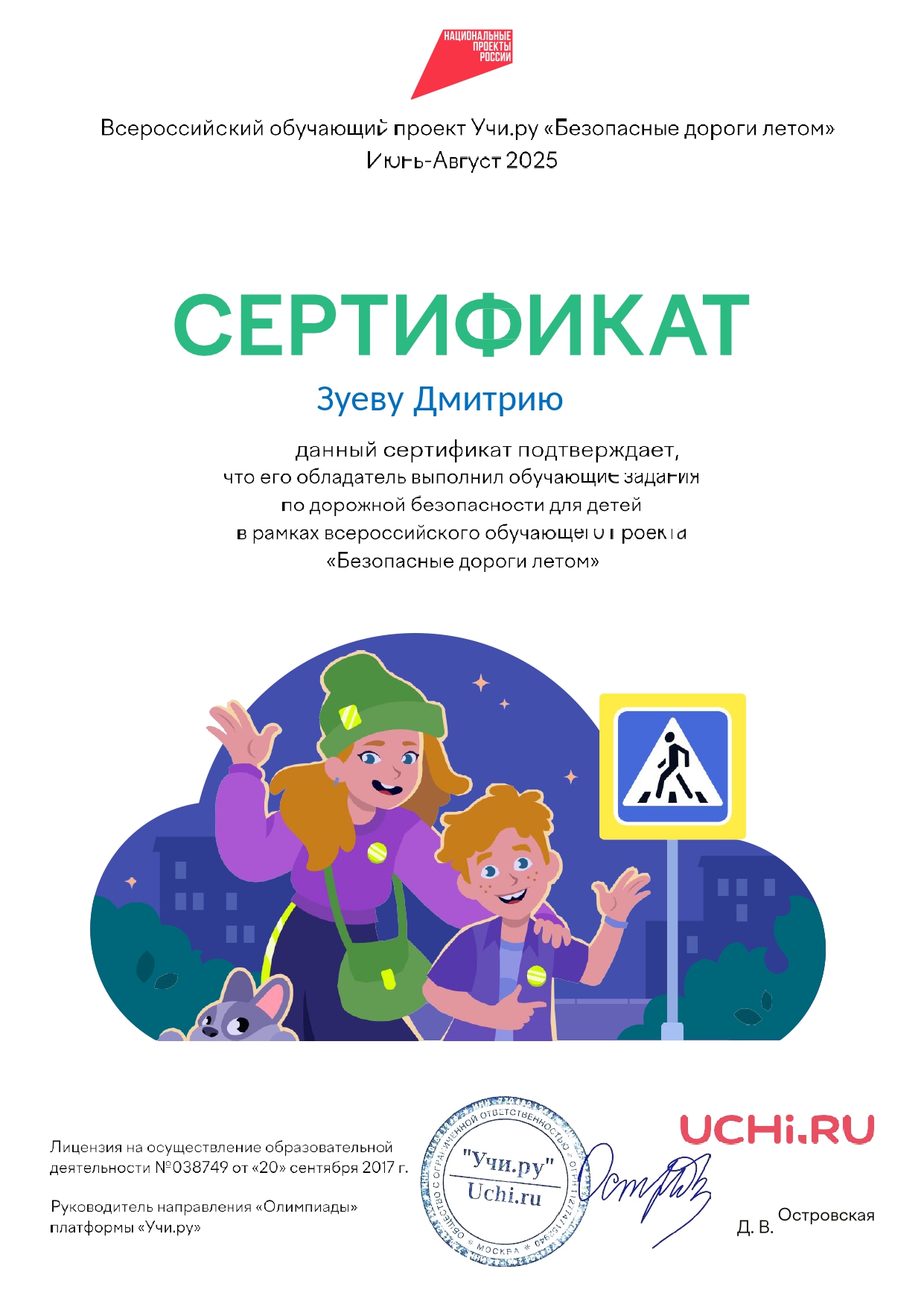 В рамках совершенствования профилактической работы по формированию безопасного поведения детей на дорогах и пропаганды знаний по безопасности дорожного движения учащиеся Кулясовского филиала МБОУ СОШ с. Русский Камешкир принимали участие во всероссийском обучающем проекте "Учи.ру "Безопасные дороги летом". За обучающие задания по дорожной безопасности каждый участник получил сертификат.
