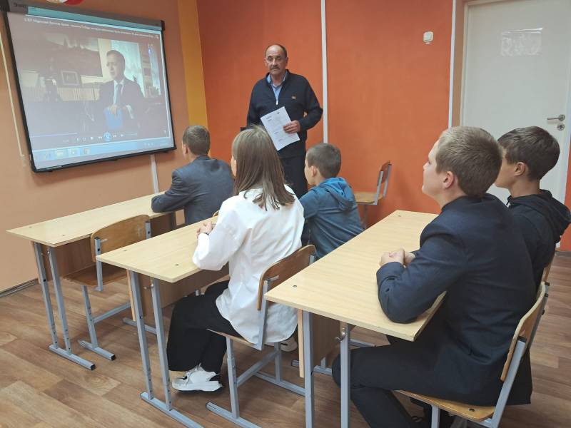 Учащиеся посмотрели видеоролик об исторических событиях с Владимиром Мединским , Помощником Президента Российской Федерации, председателем Российского военно-исторического общества.