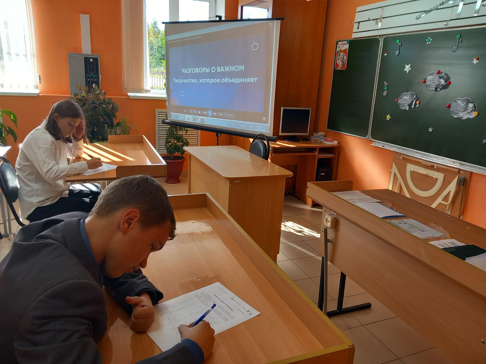 Школьники обсудили, что может создать человек с помощью слов, музыки, красок и других изобразительных средств, кто является настоящим творческим человеком и какой вид творчества им ближе всего. Они узнали о конкурсе молодых исполнителей «Интервидение», выполнили интерактивное задание «Времена года», посвященное уникальному союзу музыки и живописи. Затем ответили на вопросы учителя о том, почему русская культура является величайшей в мире и почему важно сохранять и приумножать её. Было подчёркнуто, что творчество доступно каждому: главное — желание, труд и вера в себя. #РазговорыОВажном