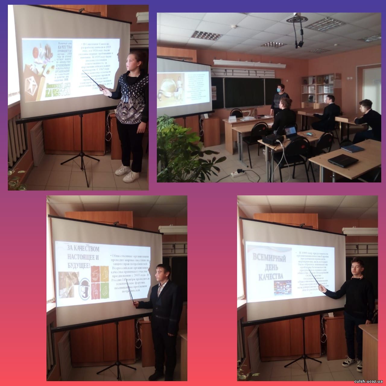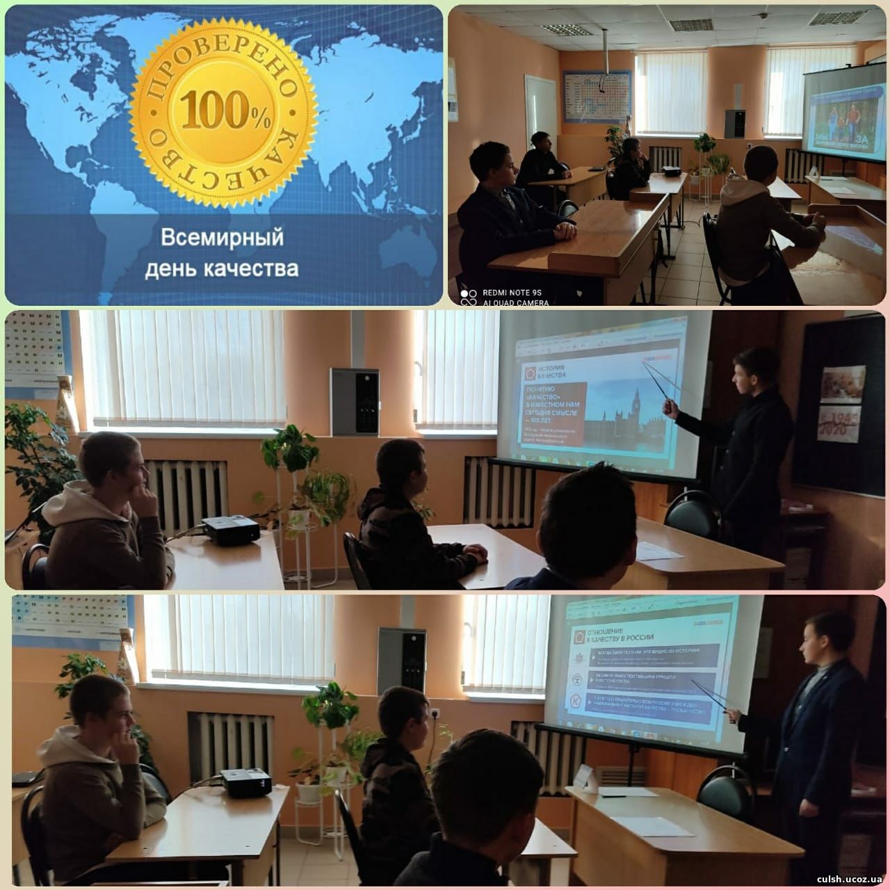 18 ноября 2020 года в Кулясовском филиале МБОУ СОШ с.Русский Камешкир прошел классный час, посвященный Всемирному дню качества. Учащиеся познакомились с деятельностью институтов качества в России и мире, с логотипами качества, поучаствовали в игровой программе "Делать качественно- делать лучше, чем есть!" Ребята узнали много интересной и полезной информации о качественной продукции и вредной.