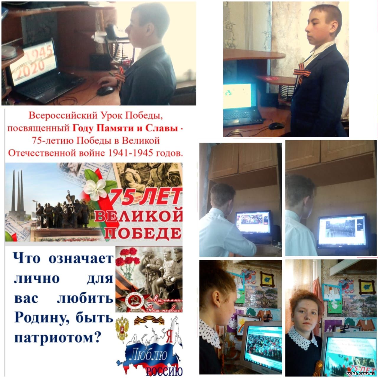Сегодня , 7 мая 2020 г., с учащимися 8 класса классным руководителем Бегаевой Л.Н. в дистанционном режиме был проведен всероссийский Урок Победы, посвященный Году Памяти и Славы – 75 – летию в Великой Отечественной войне. 9 мая - День Победы - святой для каждого из нас праздник. Мы, сегодняшние граждане страны, обязаны передать память о Победе, сами традиции празднования Дня Победы будущим поколениям. Цель Урока: формирование патриотизма, воспитание российской идентичности школьников; воспитание чувства гордости за свою Родину на примере героического прошлого дедов и прадедов учащихся, ветеранов и участников Великой Отечественной войны, на примере трудового подвига их родных и земляков в суров