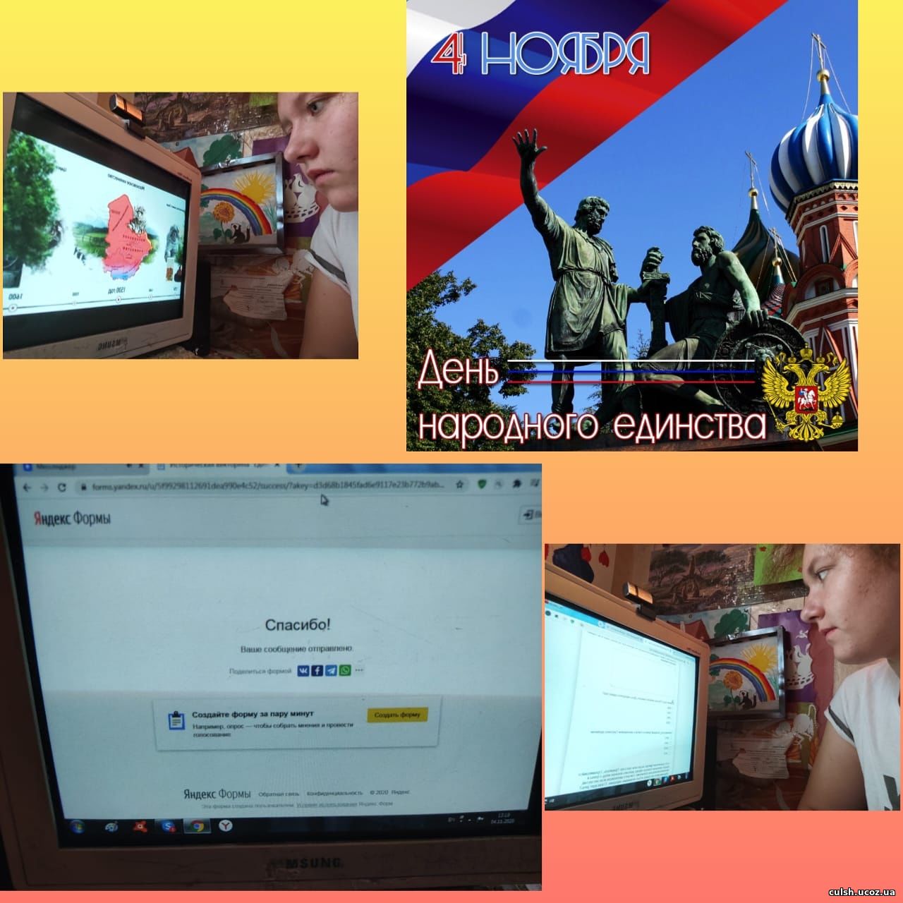 4 ноября 2020 года Коновец Анна, ученица 9 класса Кулясовского филиала МБОУ СОШ с. Русский Камешкир, посмотрела видеоролик, посвященный Дню народного Единства. После просмотра ролика ученица выполнила историческую викторину "Единство- наша сила".
