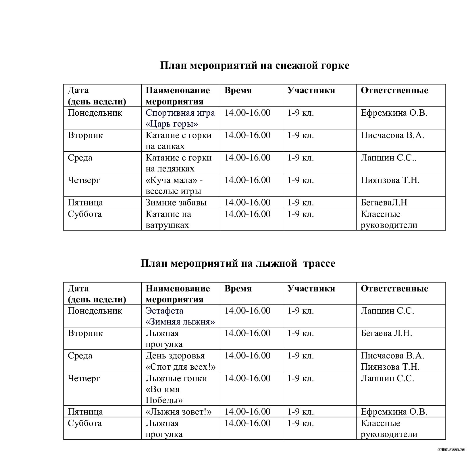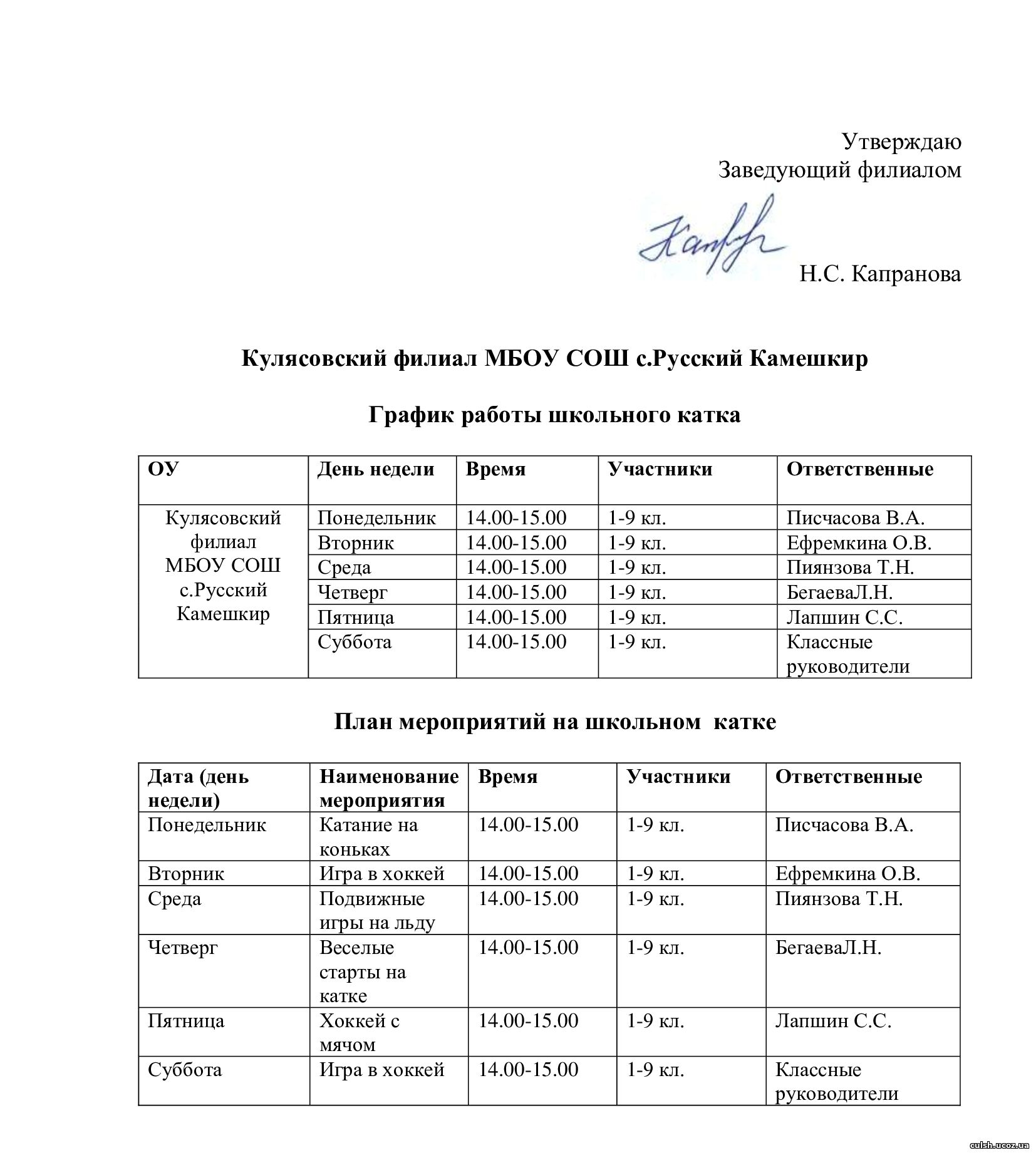 График работы школьного катка.