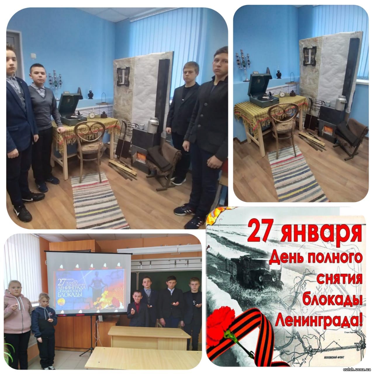 27 января 2021 года в 9 классе был проведён классный час "Жизнь в блокадном Ленинграде". В ходе мероприятия прозвучали стихи и рассказы о блокадном Ленинграде, жители которого почувствовали на себе все тяготы войны. Внимательно и серьезно ребята смотрели видеофильмы , из которых узнали об историческом значении событий тех лет. Ключевым символом памяти был кусочек хлеба весом в 125 граммов, который был продемонстрирован детям для понимания размеров суточной нормы в период блокады. В завершении мероприятия ученики с классным руководителем зажгли свечи и почтили память жителей Ленинграда, отстоявших его и не доживших до наших дней, минутой молчания.