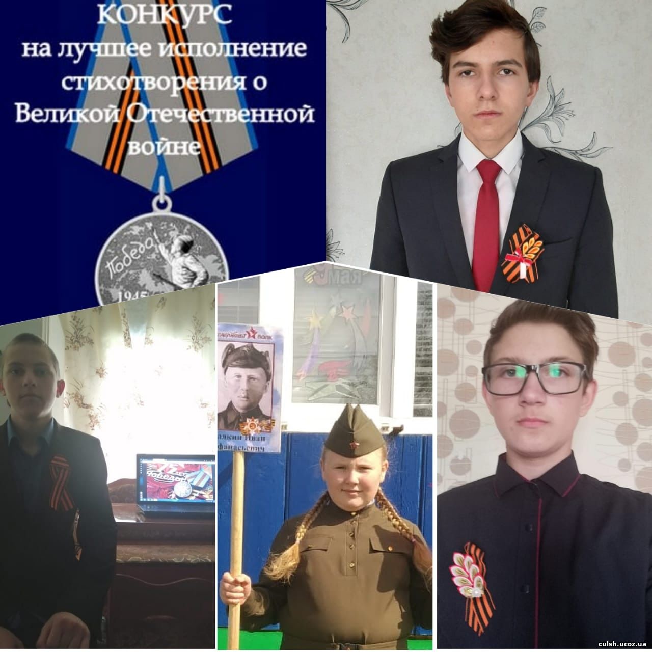 В период подготовки ко Дню Победы по инициативе Нарвского Союза ветеранов на странице «Мир навсегда» в Фейсбуке был проведен международный конкурс чтецов под девизом «Вечный огонь, нам завещанный одним, мы в сердцах храним». Ученики Кулясовского филиала МБОУ СОШ с.Русский Камешкир Капранова Кира, Морозов Александр, Назаров Николай, Галюкшов Виталий приняли участие в данном конкурсе.